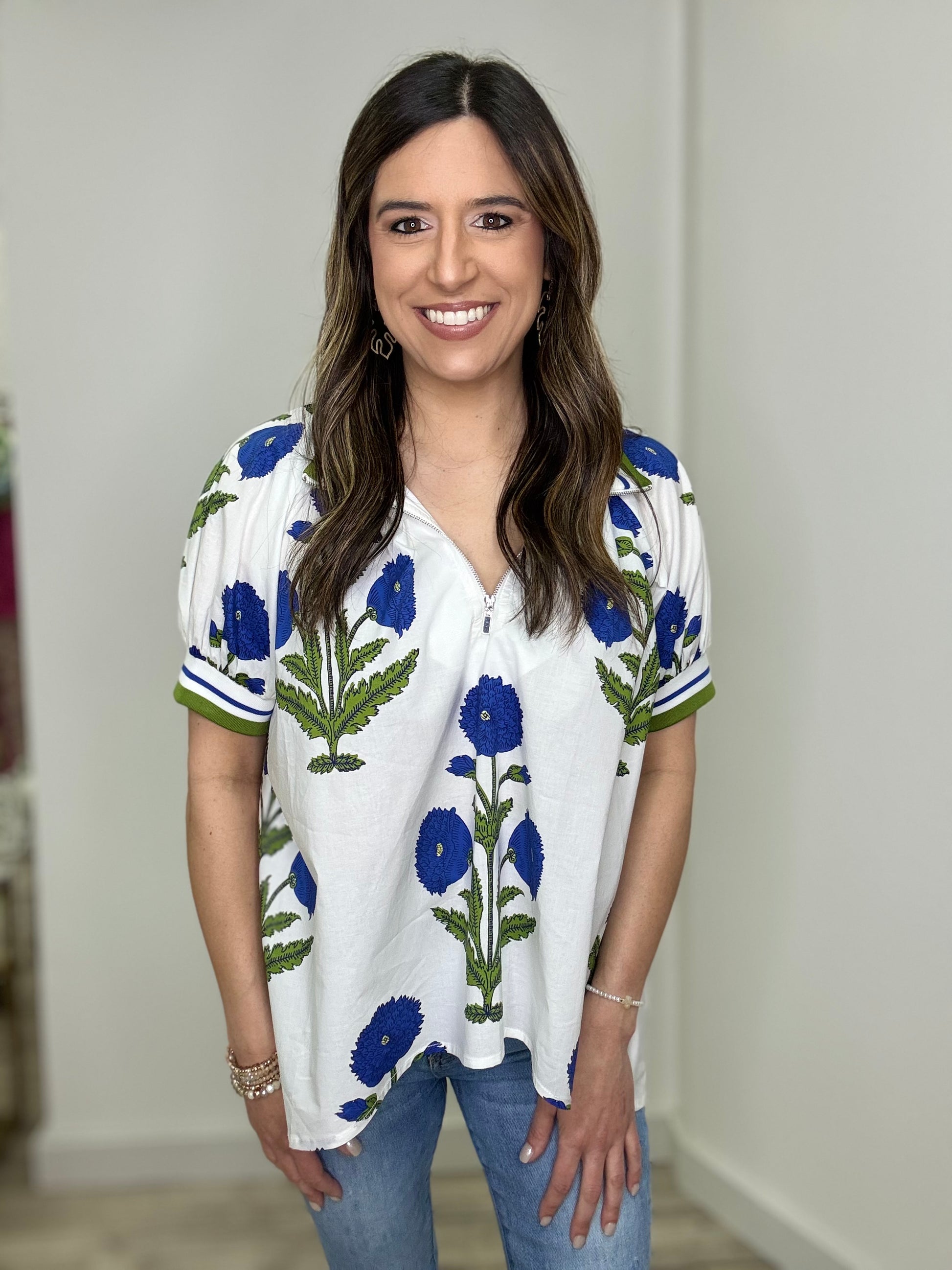 Fresh, fun, and blooming with personality, this top is made for sunny days ahead. Featuring a crisp white backdrop with vibrant blue floral prints and lively green stems, it brings an instant pop of Spring to your wardrobe. The relaxed, flowy silhouette keeps it effortlessly comfortable, while the sporty zip-up neckline and contrast trim at the collar and sleeves add a playful, modern touch. Lightweight and breezy, it pairs perfectly with your favorite denim or white bottoms for a look that’s polished yet carefree. From brunch dates to weekend strolls, this top is ready to blossom wherever you go.