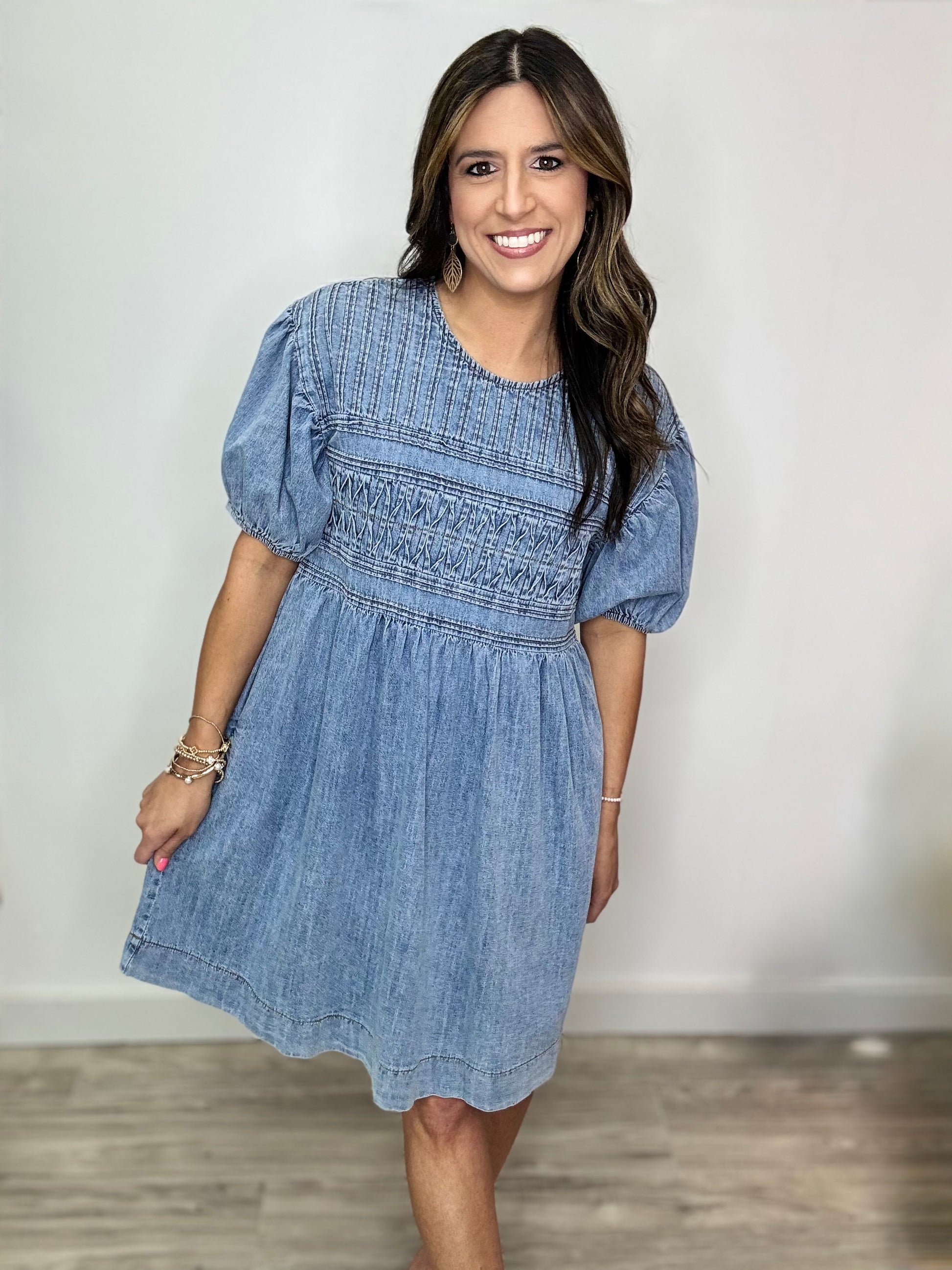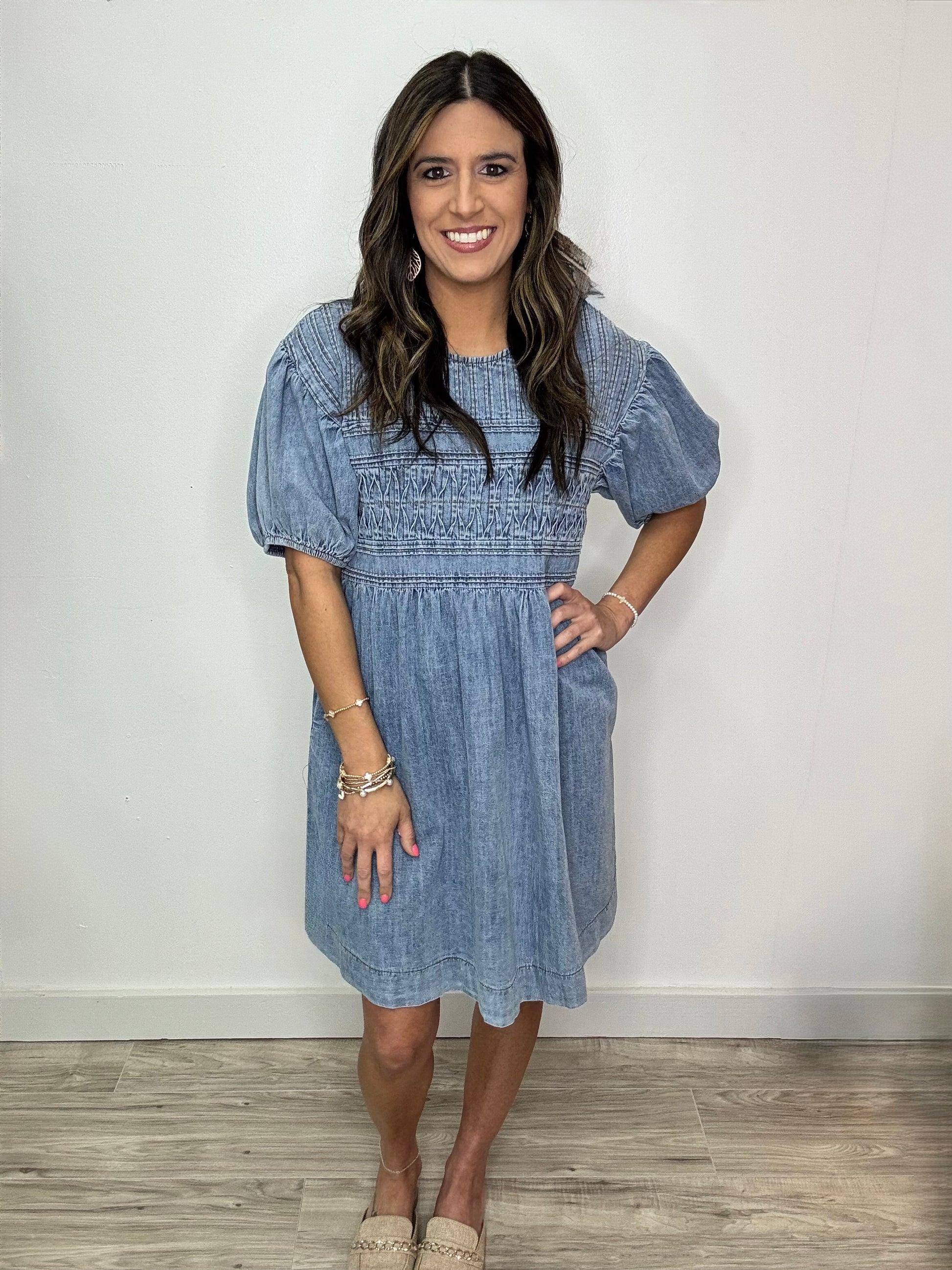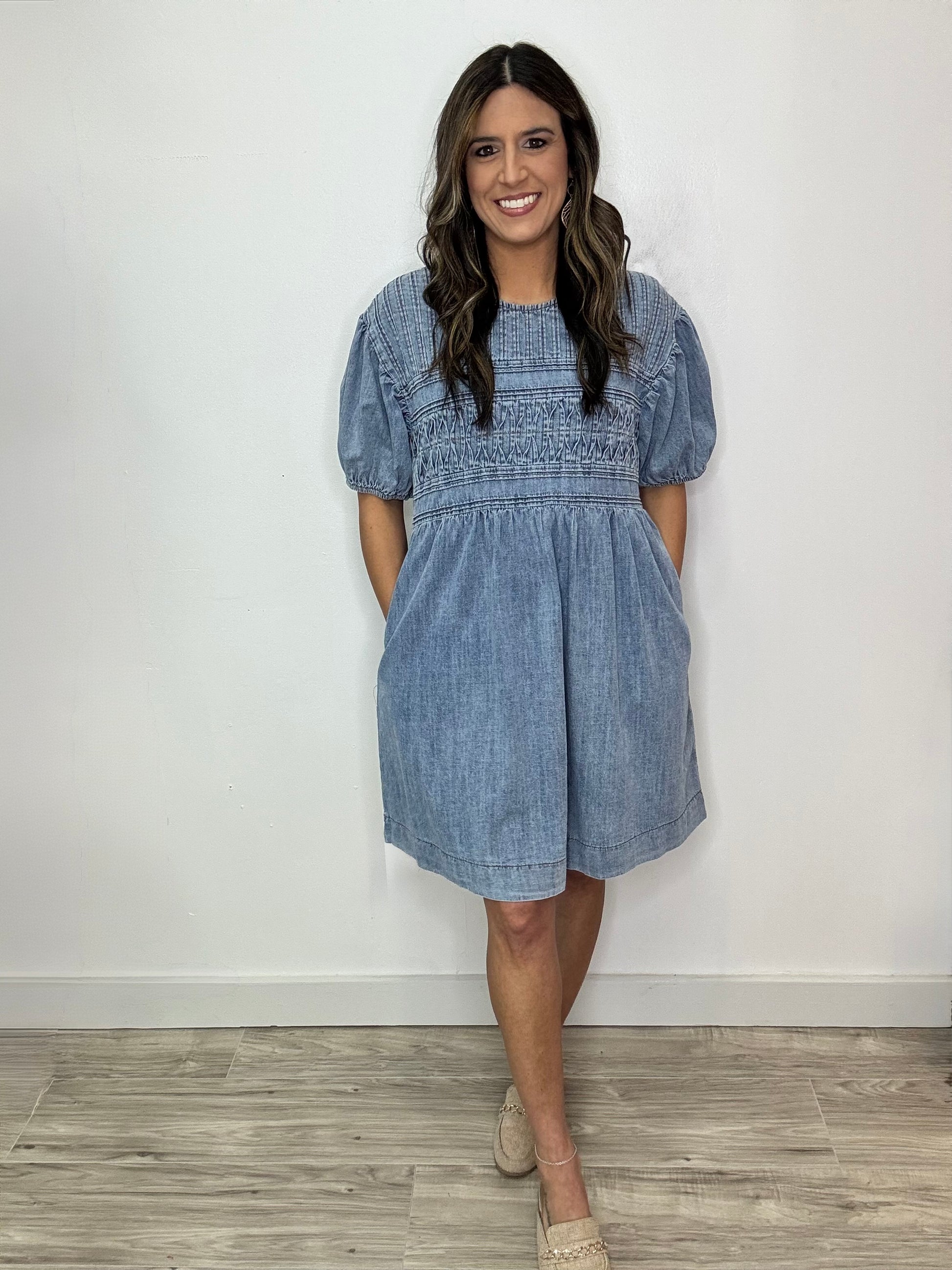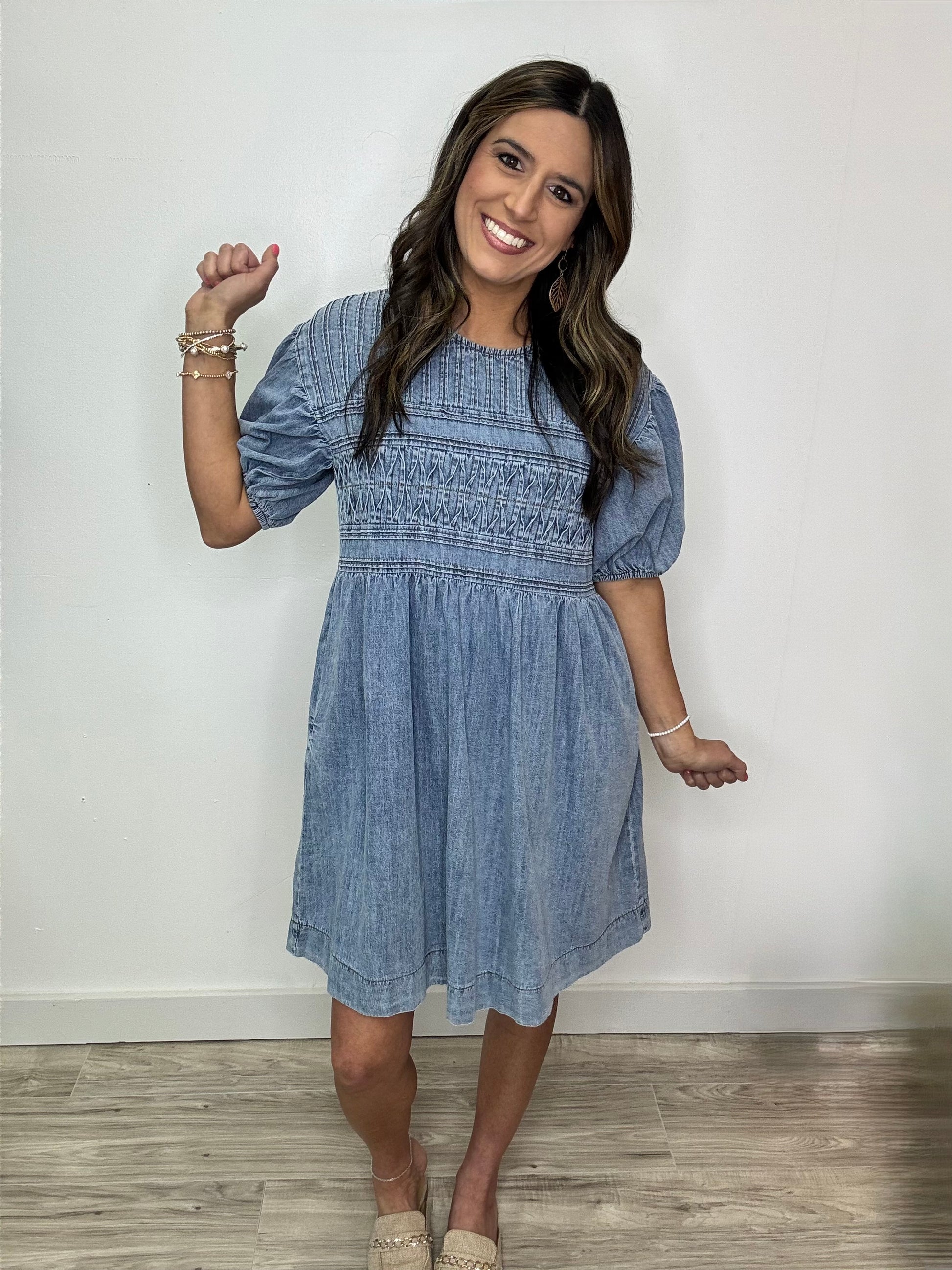 This playful babydoll style denim dress features charming puff sleeves and adorable pintuck details on the front chest. A keyhole closure at the back adds a sweet touch, while convenient side pockets keep essentials close. Perfect for your next concert, it pairs effortlessly with boots or sneakers for a fun, casual look.