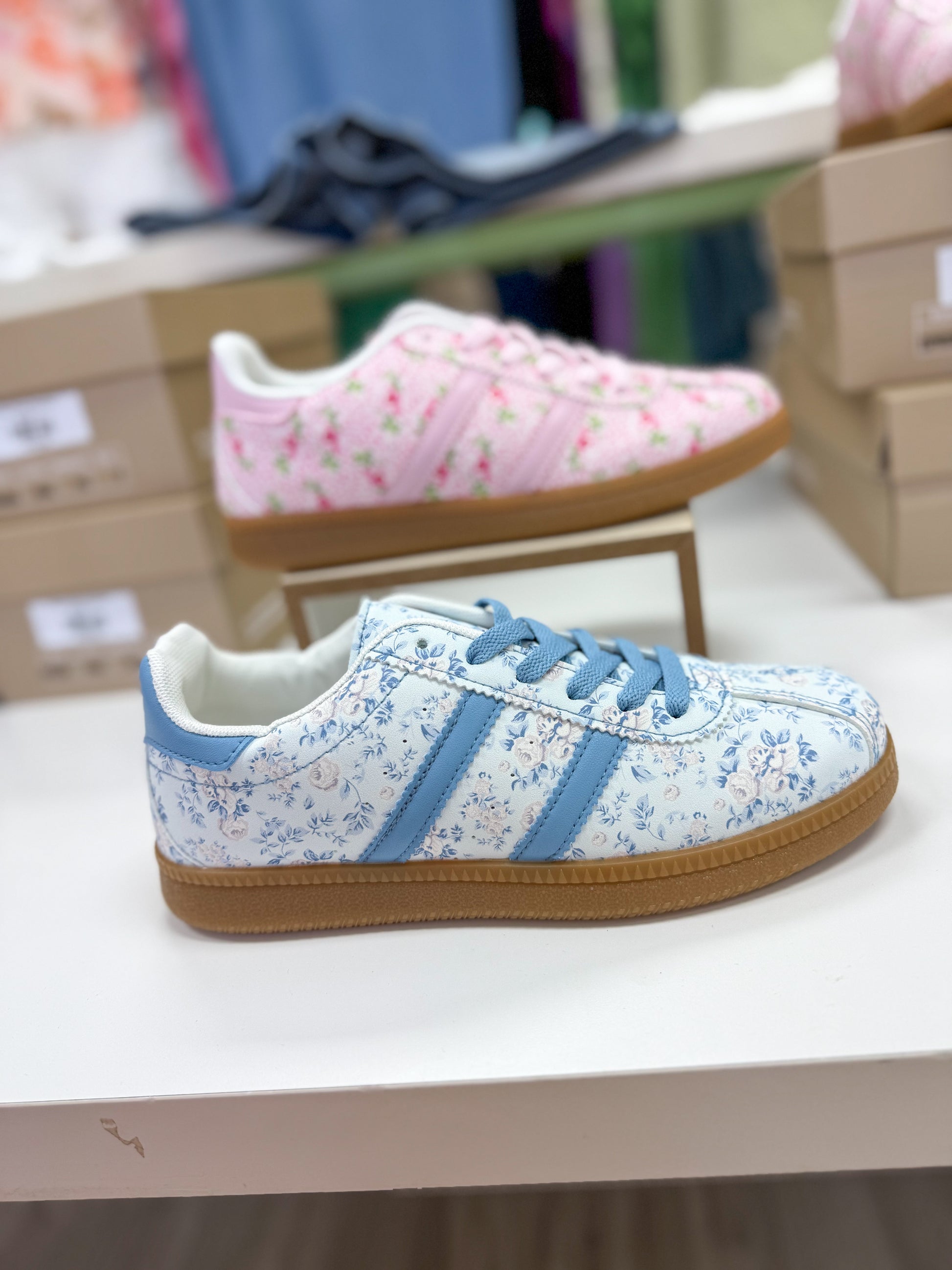 Step into the season with the Fran Floral Sneaker! Featuring a charming light blue floral print, blue laces, and a contrasting brown sole, these sneakers add a playful pop to any outfit. Perfect for brightening your look this season, they’re as cute as they are comfortable. Get ready to turn heads and enjoy every step!