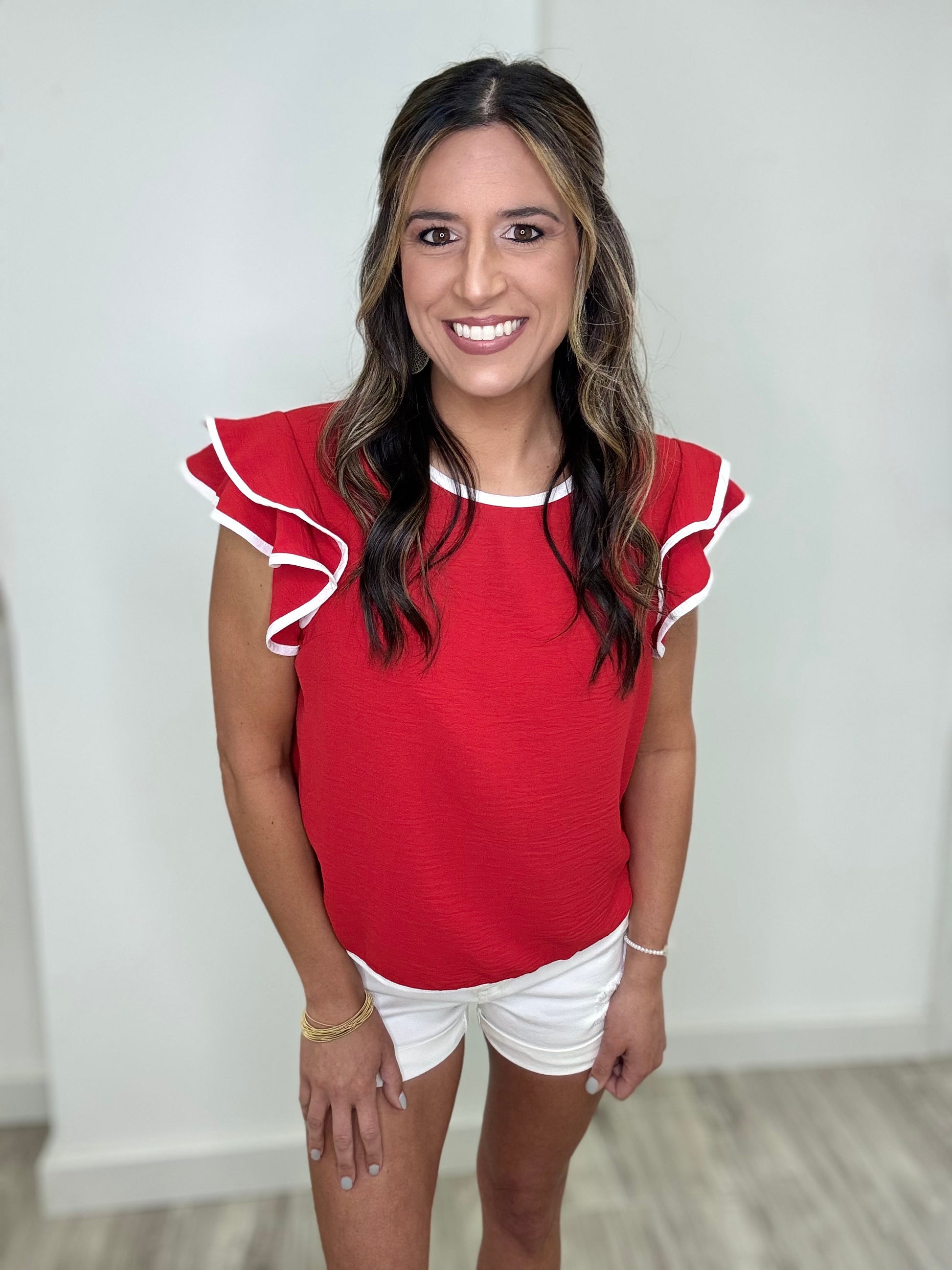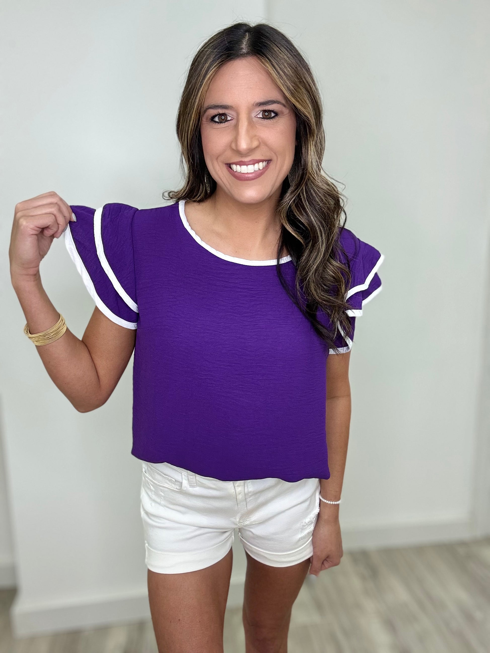 Show your team spirit in style with the Go Team Top, available in vibrant red and purple—two of our favorite colors! This playful top features charming ruffle sleeves accented with crisp white piping for a fun, fresh look. Perfect for game day or any casual event, it’s an easy way to stay cute and comfortable while cheering on your team. Grab yours and get ready to celebrate in style!