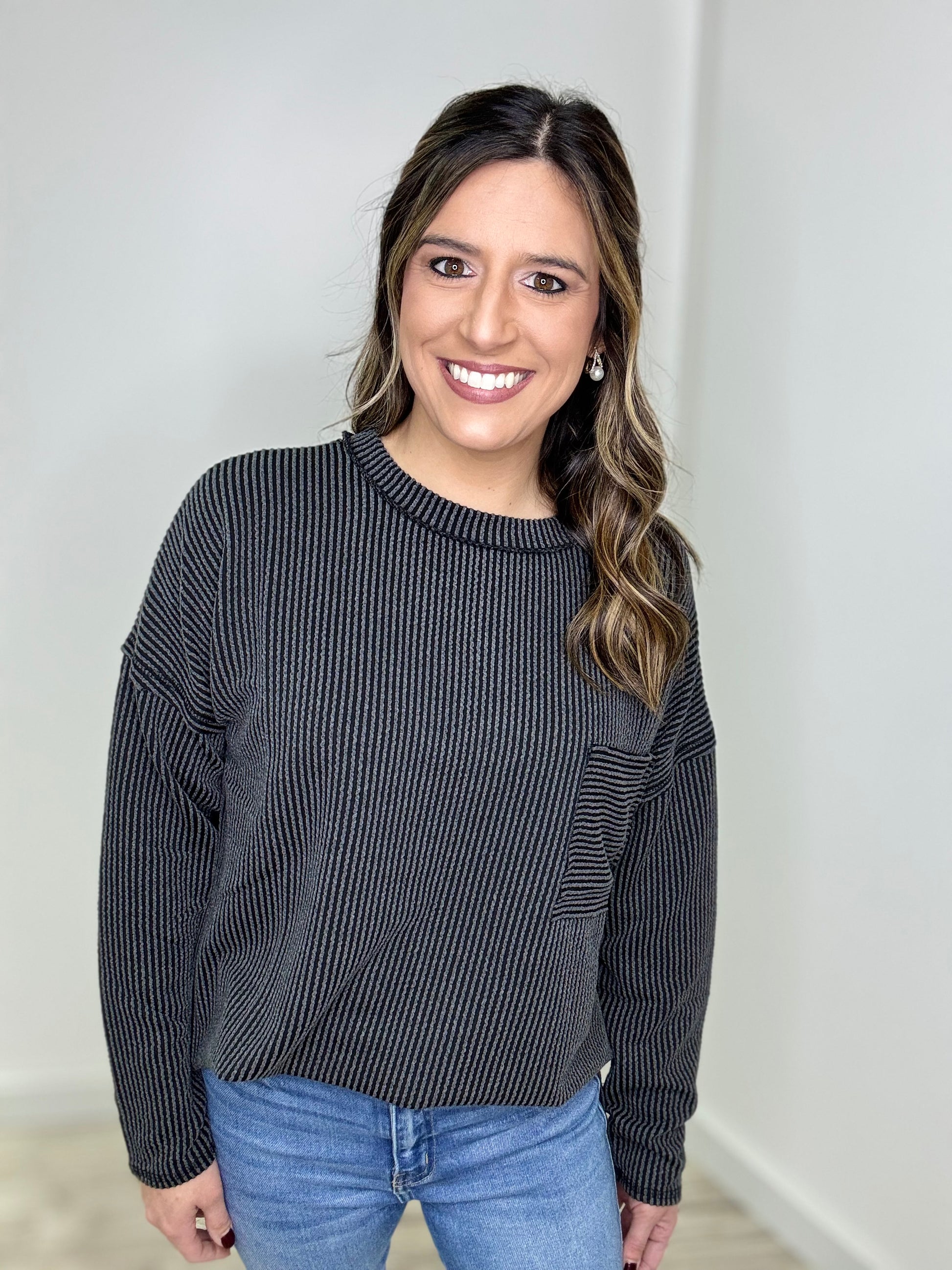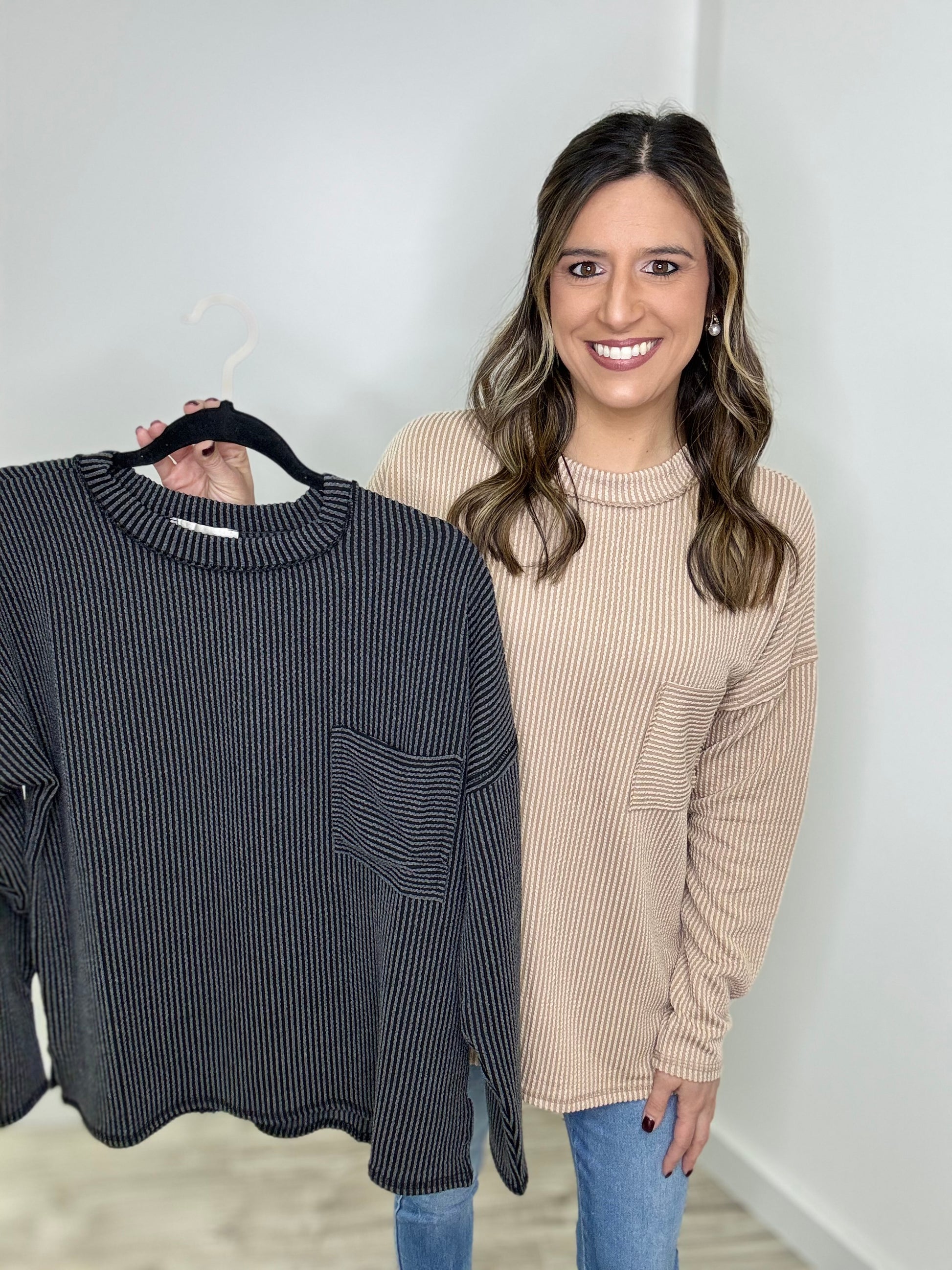 Meet your new wardrobe essential—the Just Right Top! This ribbed long sleeve features a classic round neckline and a handy front chest pocket for that perfect blend of style and function. Available in versatile charcoal and light mocha, these neutral shades pair effortlessly with everything from denim to leggings. Throw it on with your favorite sneakers for an instantly put-together look that works for any occasion. Simple, comfortable, and endlessly wearable—this is the ribbed top you didn't know you needed.