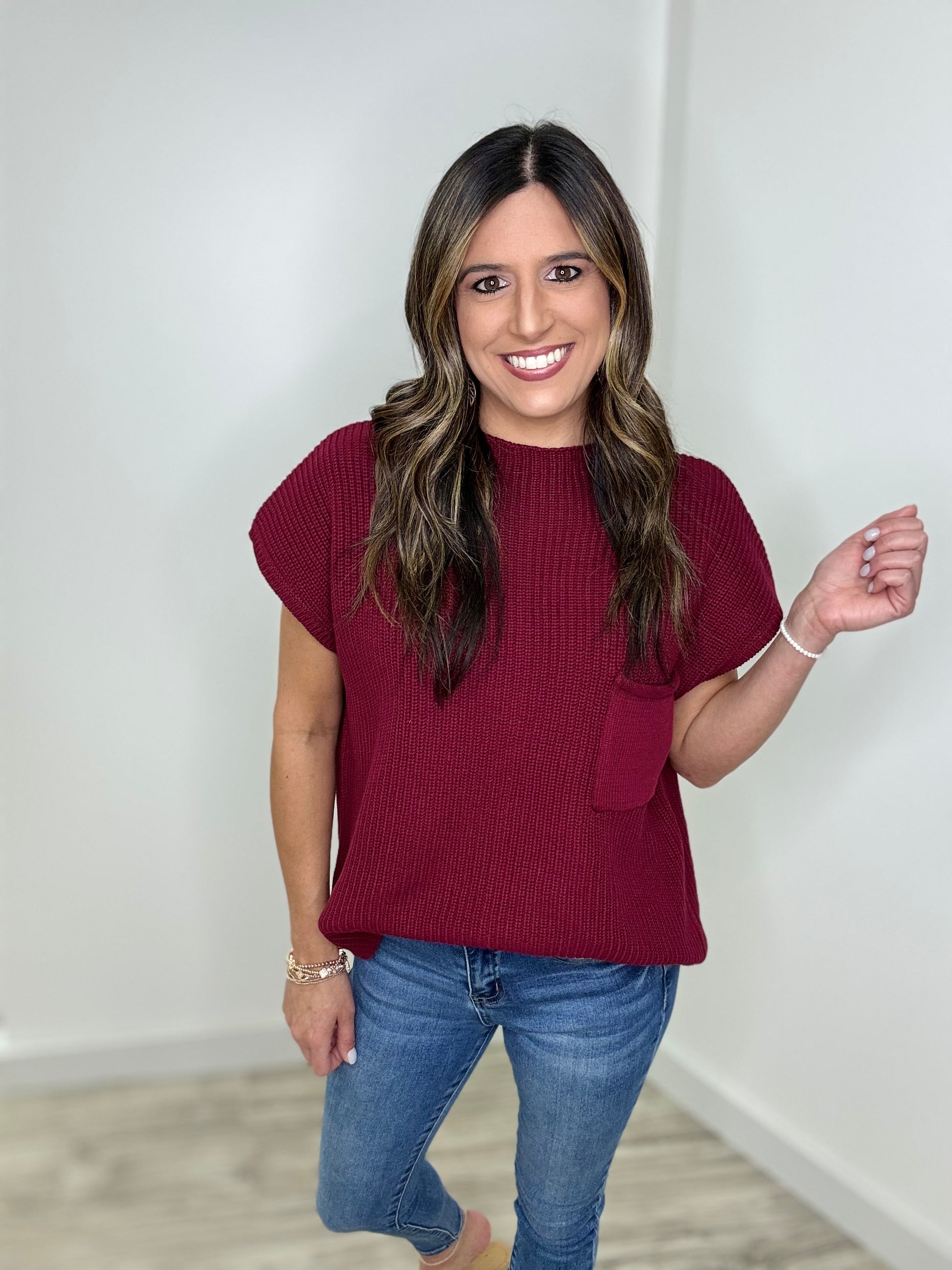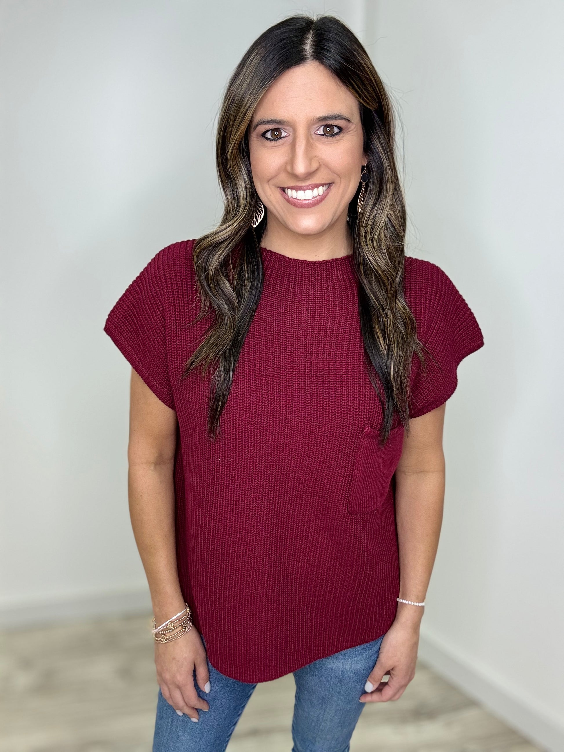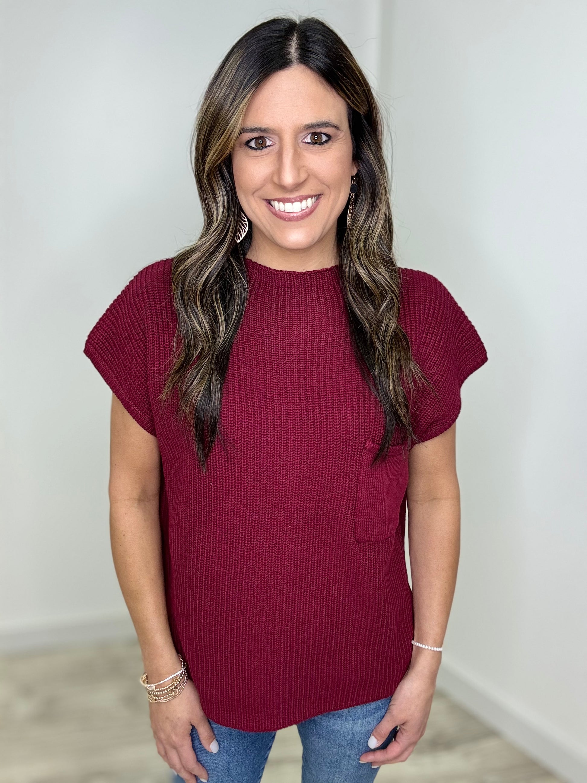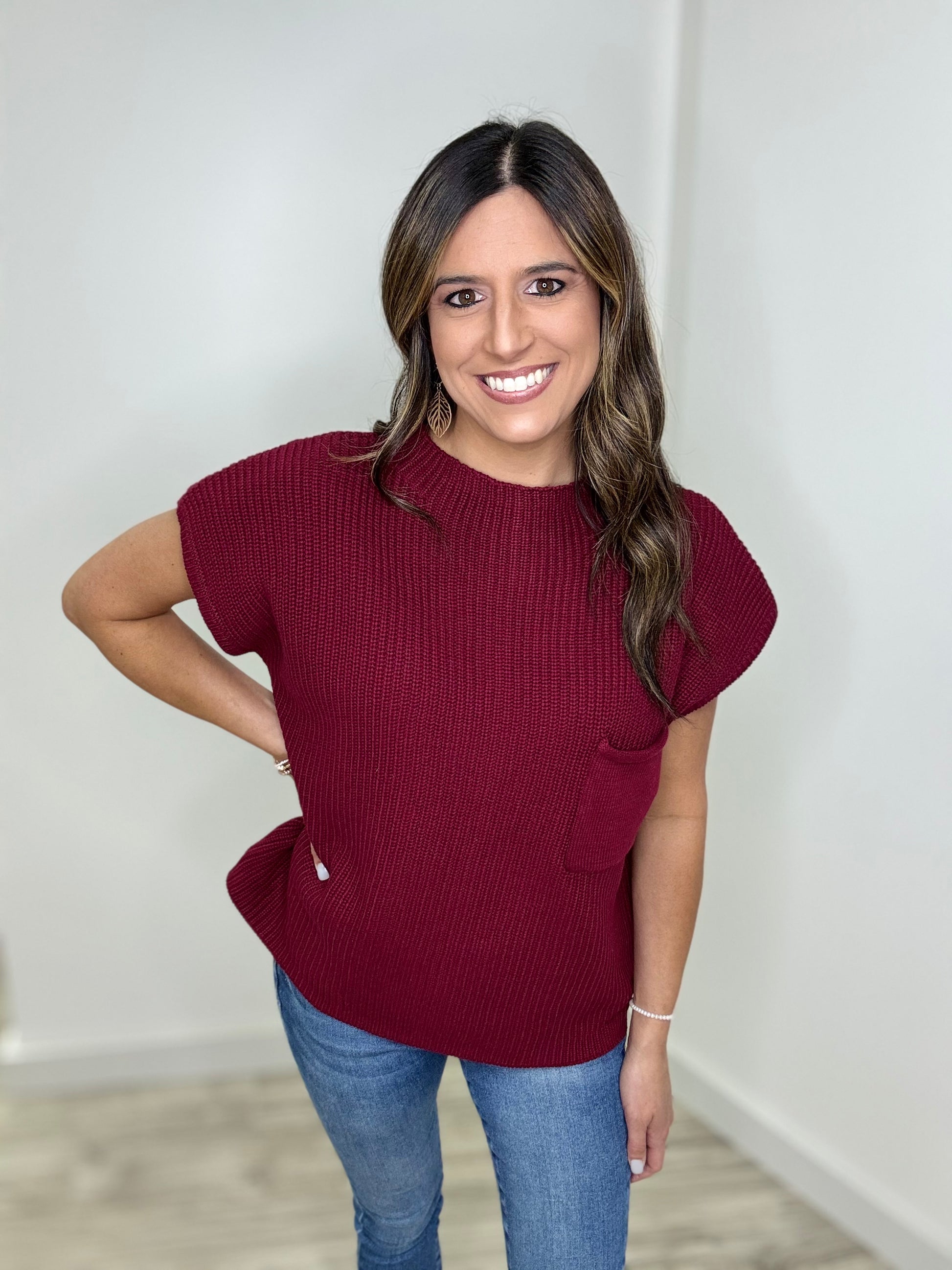 The colors in the Looking For You Top are everything! This playful mock neck sweater features cozy drop shoulder short sleeves and a cute front chest pocket. Choose between gorgeous cabernet and deep camel—both perfect for getting you in the mood for Fall. Pair with your favorite denim or black jeans for a stylish night out this season!