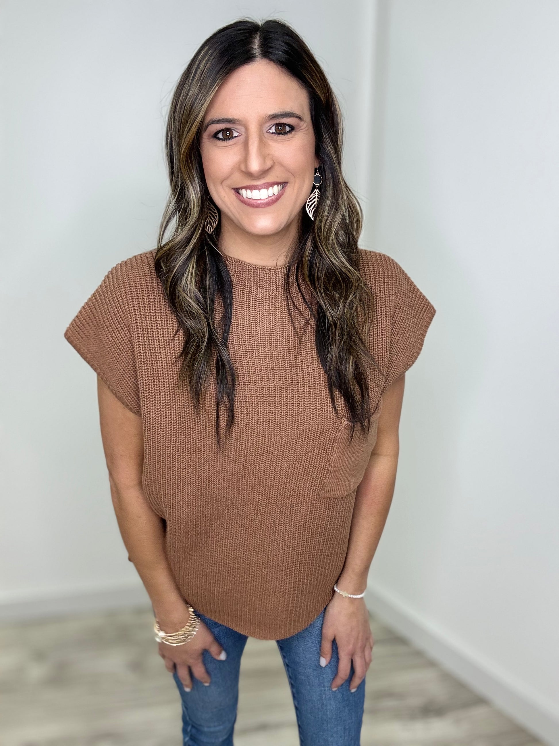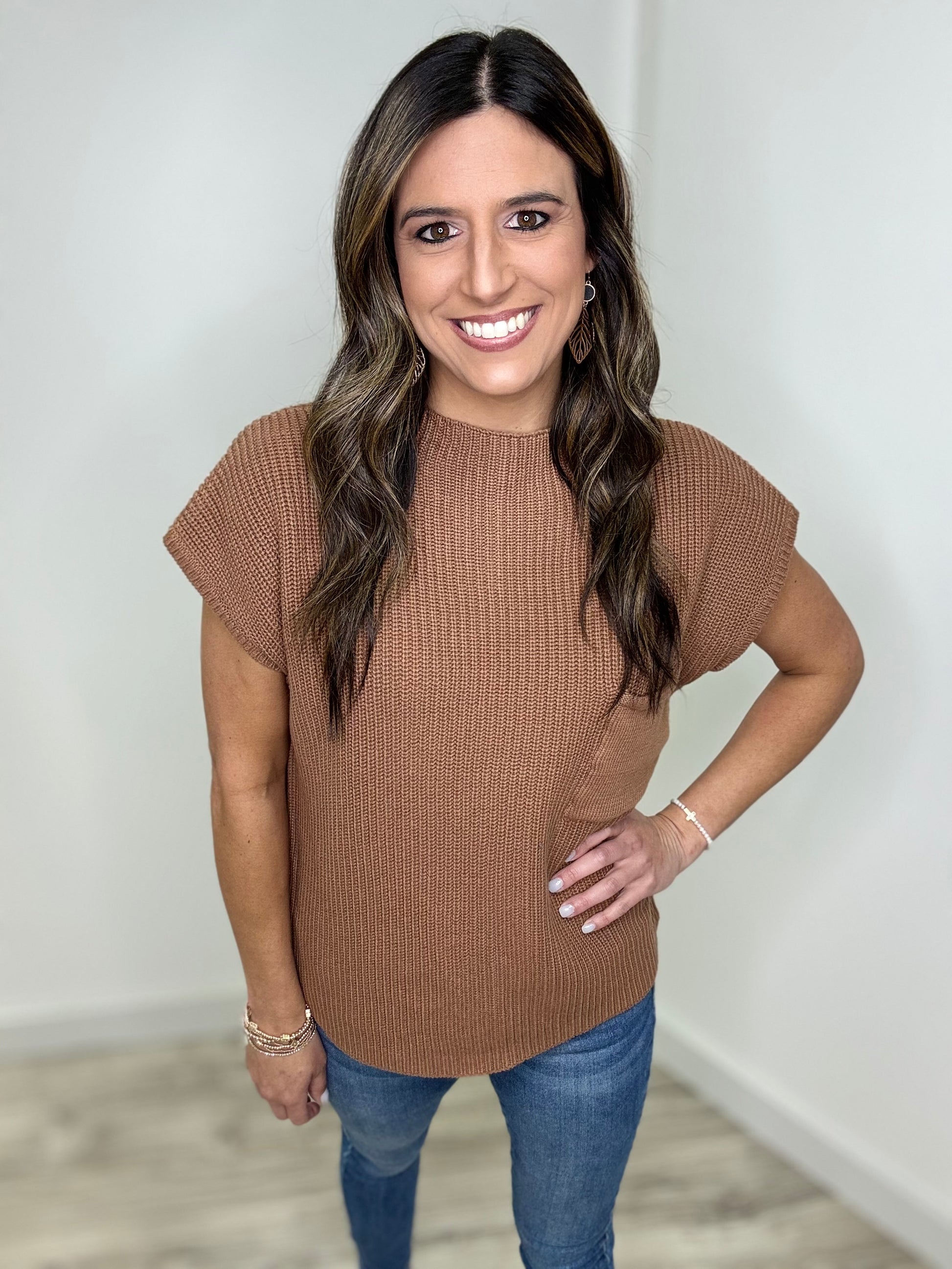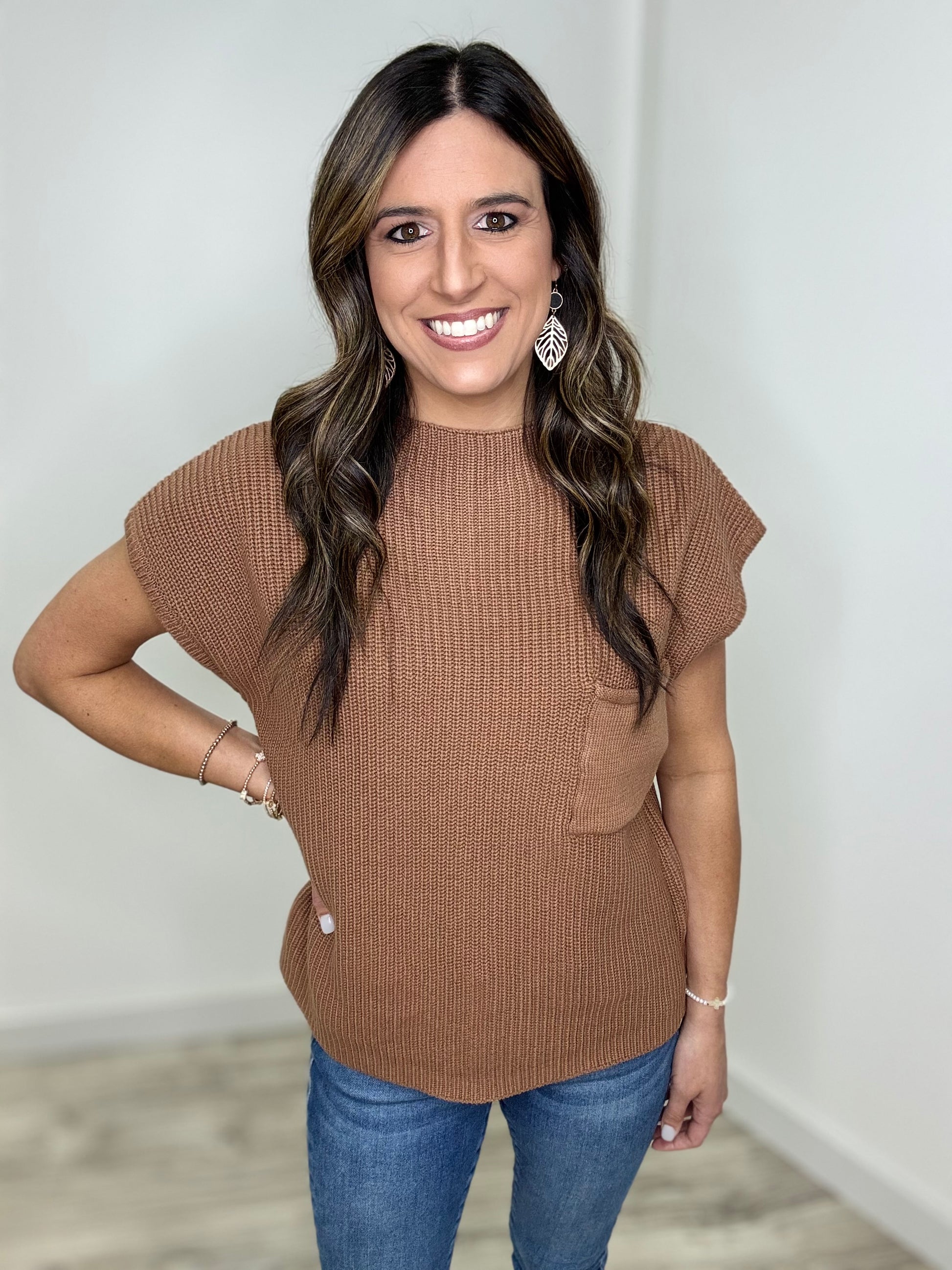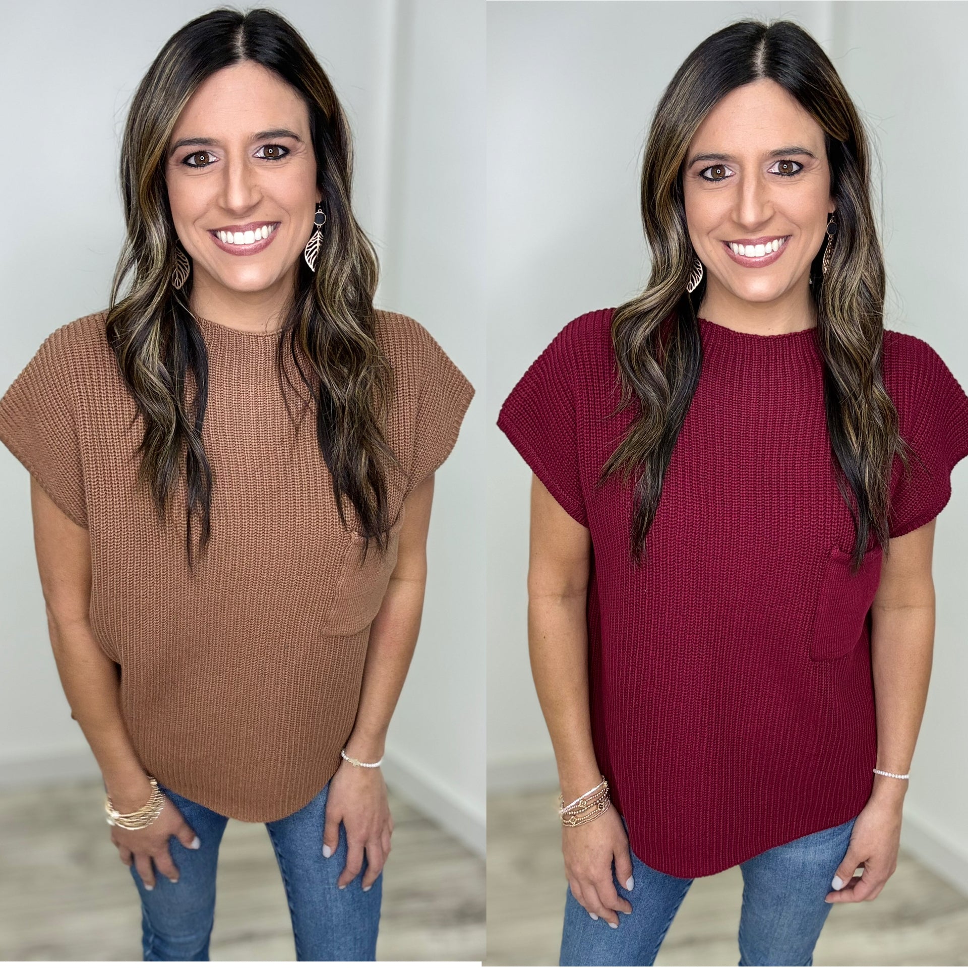The colors in the Looking For You Top are everything! This playful mock neck sweater features cozy drop shoulder short sleeves and a cute front chest pocket. Choose between gorgeous cabernet and deep camel—both perfect for getting you in the mood for Fall. Pair with your favorite denim or black jeans for a stylish night out this season!