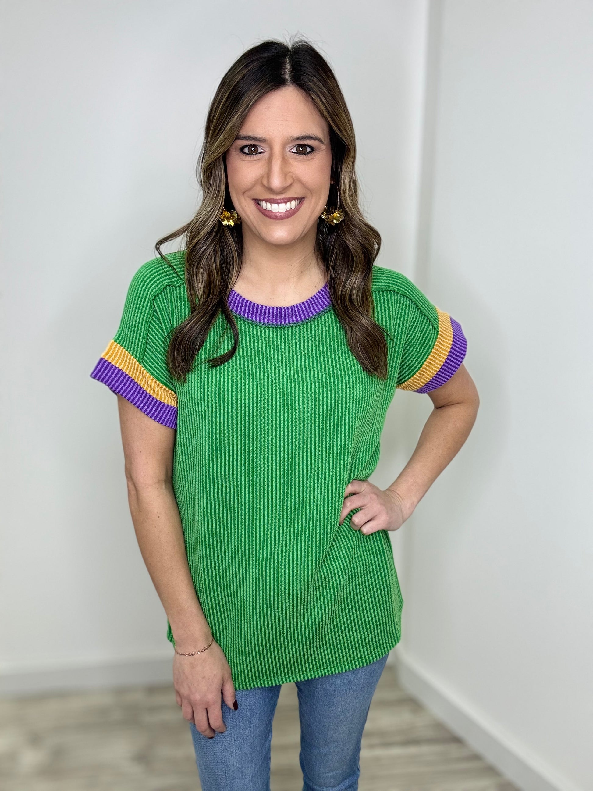 Celebrate the spirit of Mardi Gras in this vibrant ribbed top! Featuring a classic short sleeve, round neck design, this piece brings festive flair to any parade or party. Choose between bold purple with green and gold accents or striking green with purple and gold trim. This ribbed fabric layers beautifully under jackets when temperatures drop, while pairing perfectly with denim and your favorite Mardi Gras kicks. Whether you're dancing in the streets or cheering from the sidelines, this easy-to-wear essential captures all the joy and color of the season.