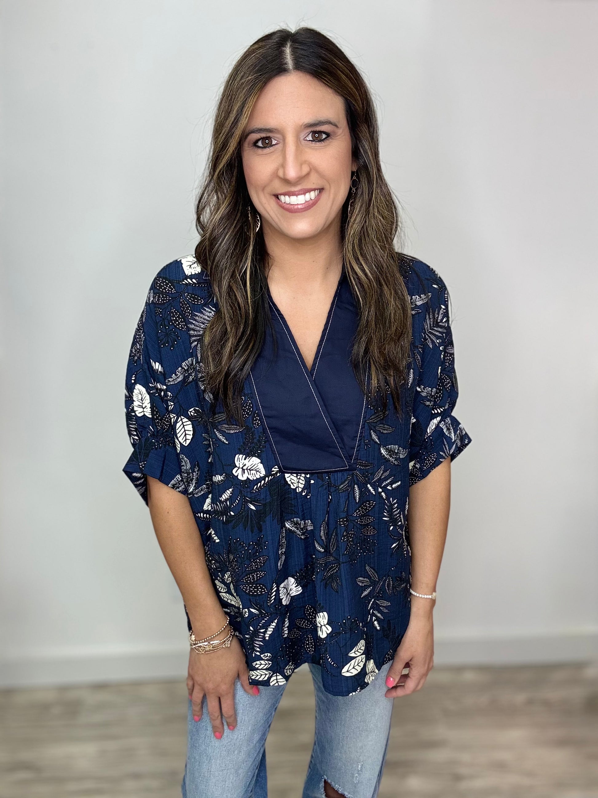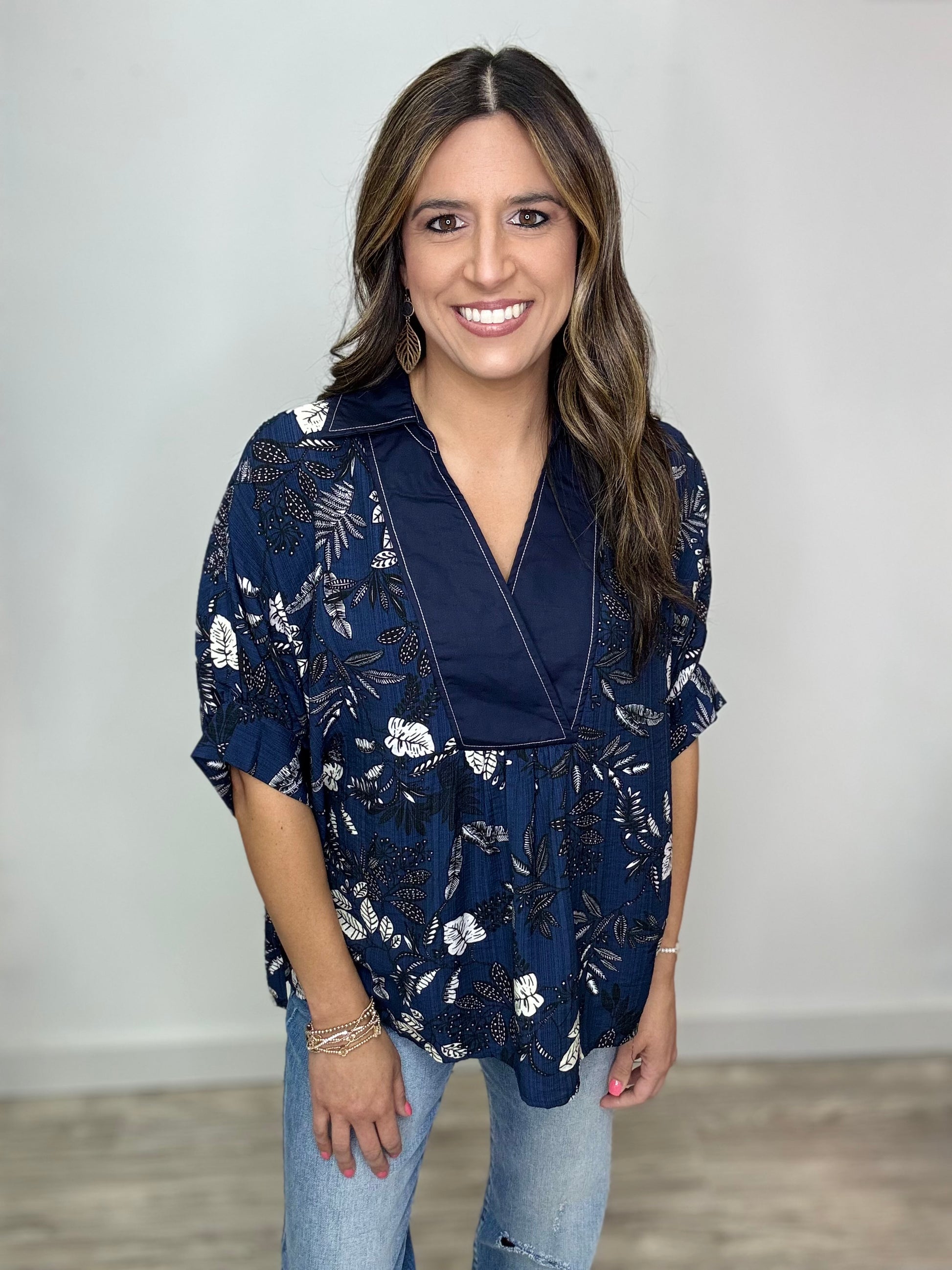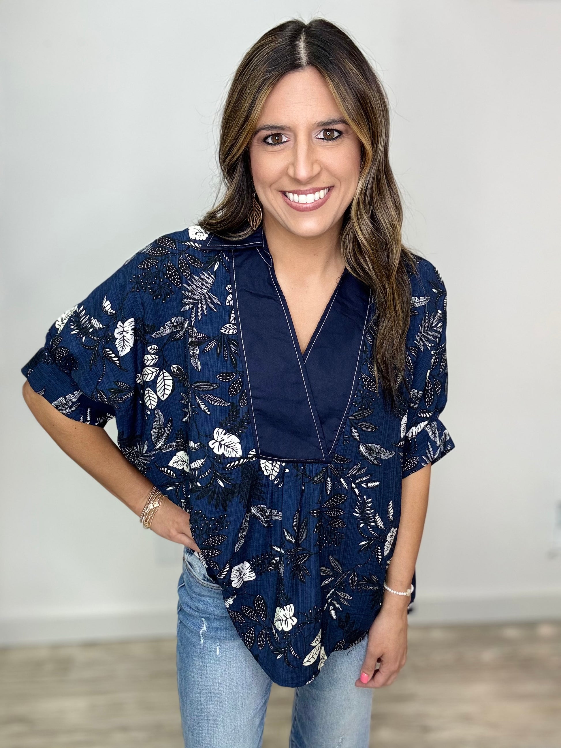 This Midnight Moves Top pairs navy blue and midnight blue for a stunning color combo that’s hard to beat. Featuring a black and white floral print, a navy base with crisp white stitching, and a flattering collared V-neck, it’s designed with dolman short sleeves for a relaxed, playful fit. We love how this cute top effortlessly blends style and comfort for your everyday moves.