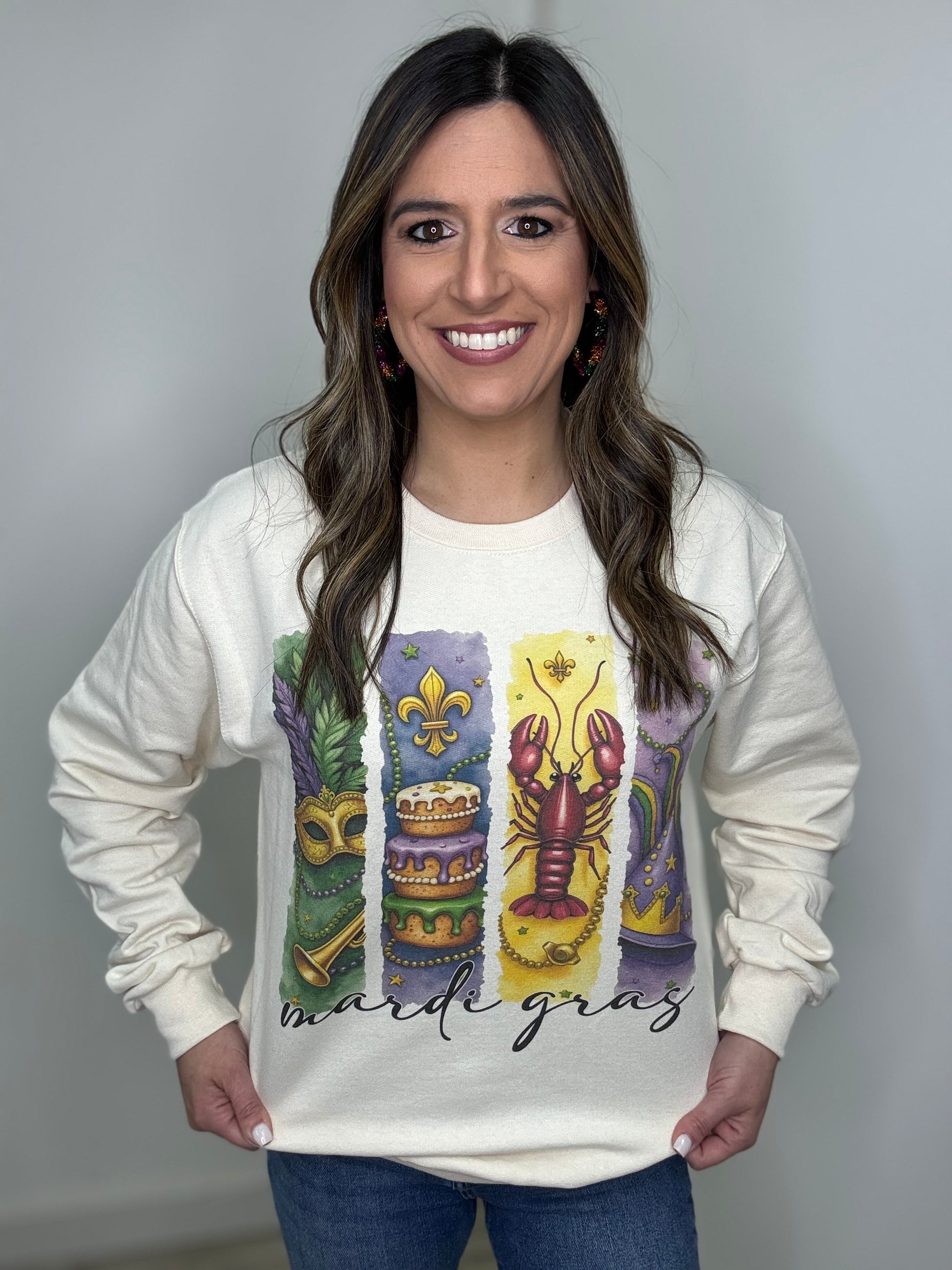 It's a celebration of all things Mardi Gras! This graphic sweatshirt's design features four illustrated panels, each with a different Mardi Gras themed composition, including a mask with a trumpet, a cake with a fleur de lis, a crawfish with a gold beaded necklace, and a hat with a green beaded necklace, and underneath are the words, "mardi gras." This top is perfect for Mardi Gras season!