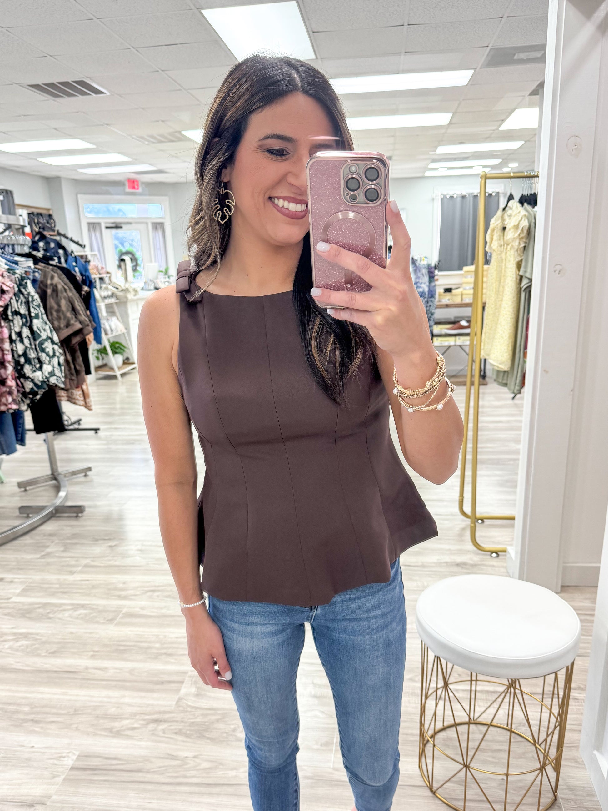 This chocolate brown sleeveless top delights with a charming bow on the shoulder and a flirty peplum hem. The side zipper closure offers a sleek fit, perfect for slipping on and stepping out. Style it with a cute skirt or your favorite denim and heels to create an irresistible date night outfit full of sweet, playful vibes.