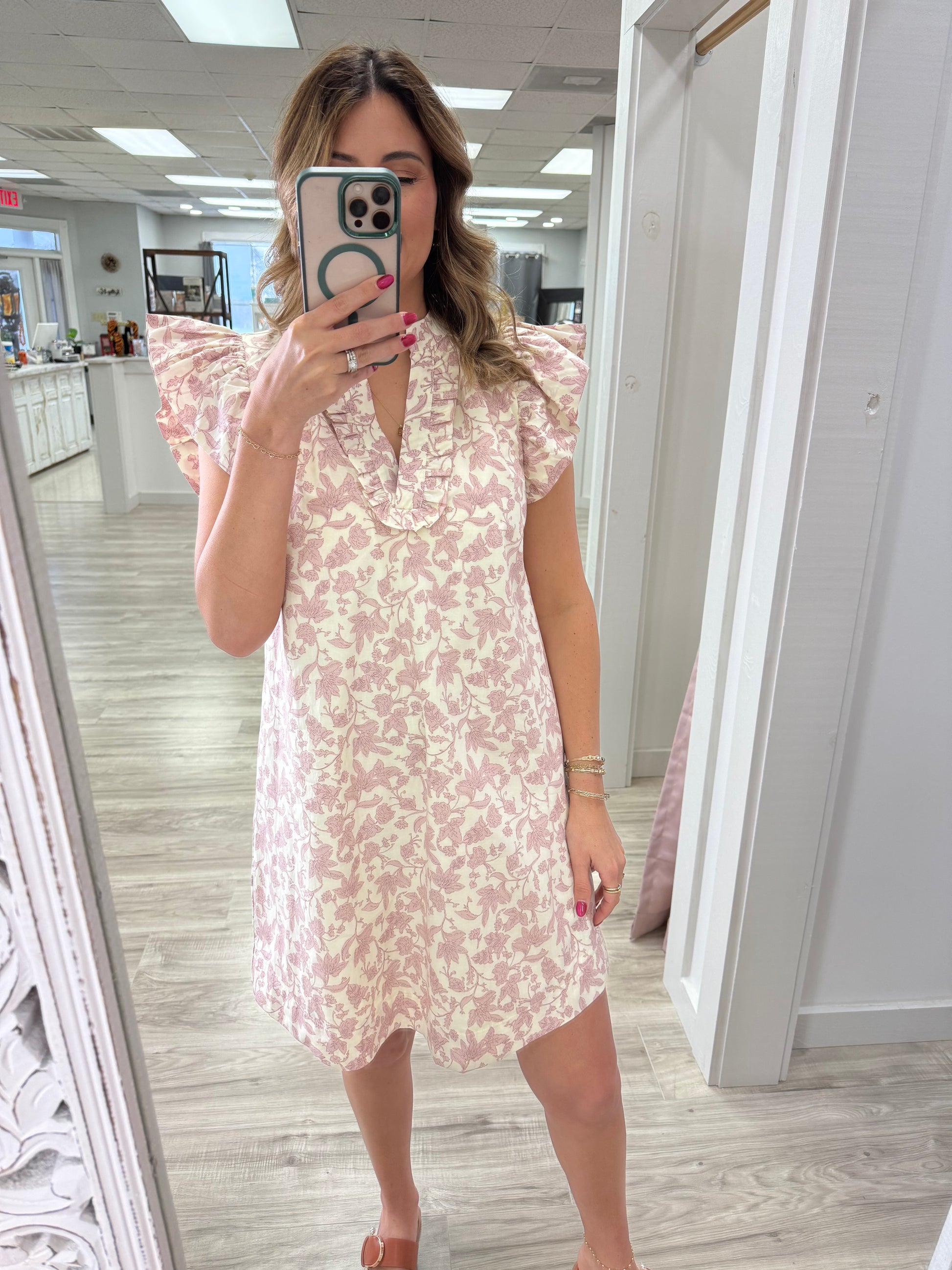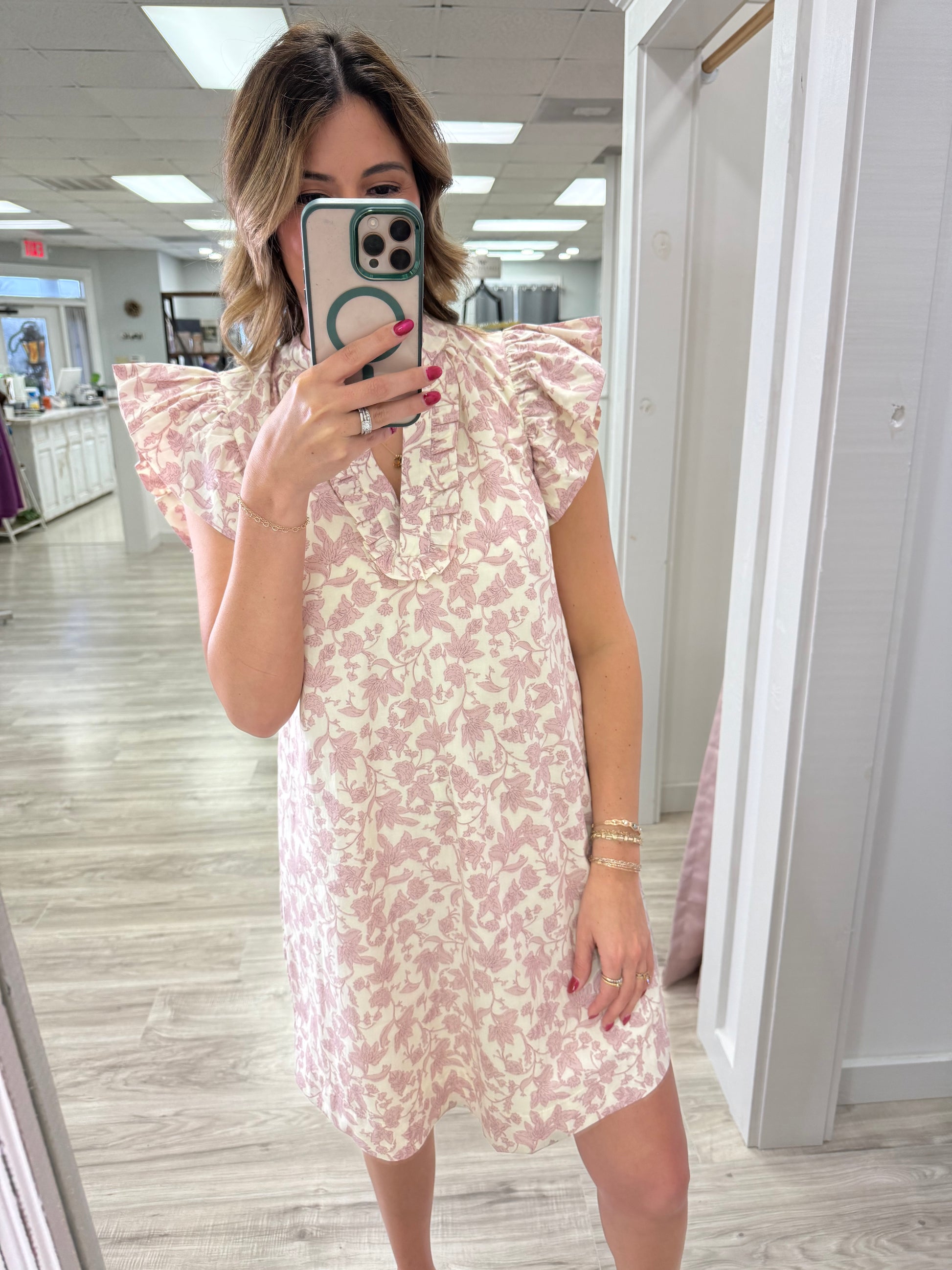 This light pink and cream vintage floral dress is full of feminine charm. The delicate floral print gives it a classic, heirloom-inspired feel, while the airy silhouette keeps it fresh and easy to wear. Ruffle short sleeves add a sweet, playful touch, perfectly complementing the ruffle-trimmed V-neckline for a beautifully detailed finish. Fully lined for comfortable, confident wear, this dress is perfect for brunches, showers, or any moment that calls for something pretty and polished.