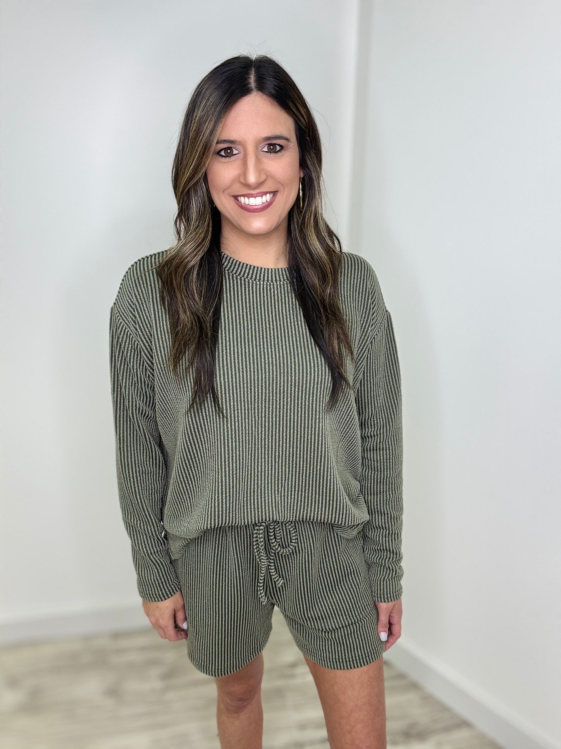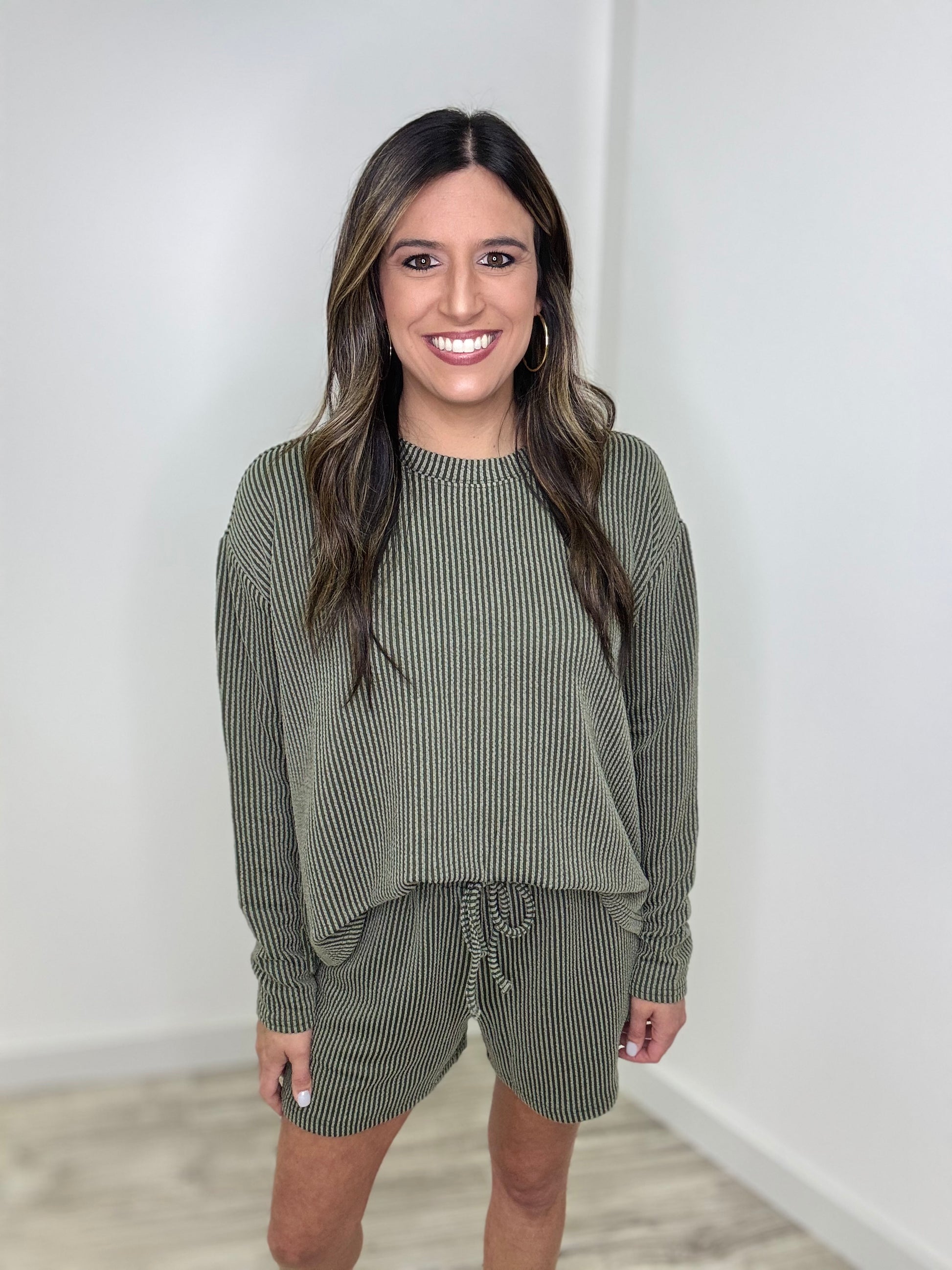 Embrace the ribbed trend with The Ribbed Set in a charming olive hue! This playful set features a cozy long sleeve top with a round neckline and comfy shorts with an elastic waist, adjustable tie, and pockets. Perfect for running errands, cheering at the ballpark, or relaxing at home, this set combines style and comfort effortlessly. Don’t miss out on your new favorite outfit!