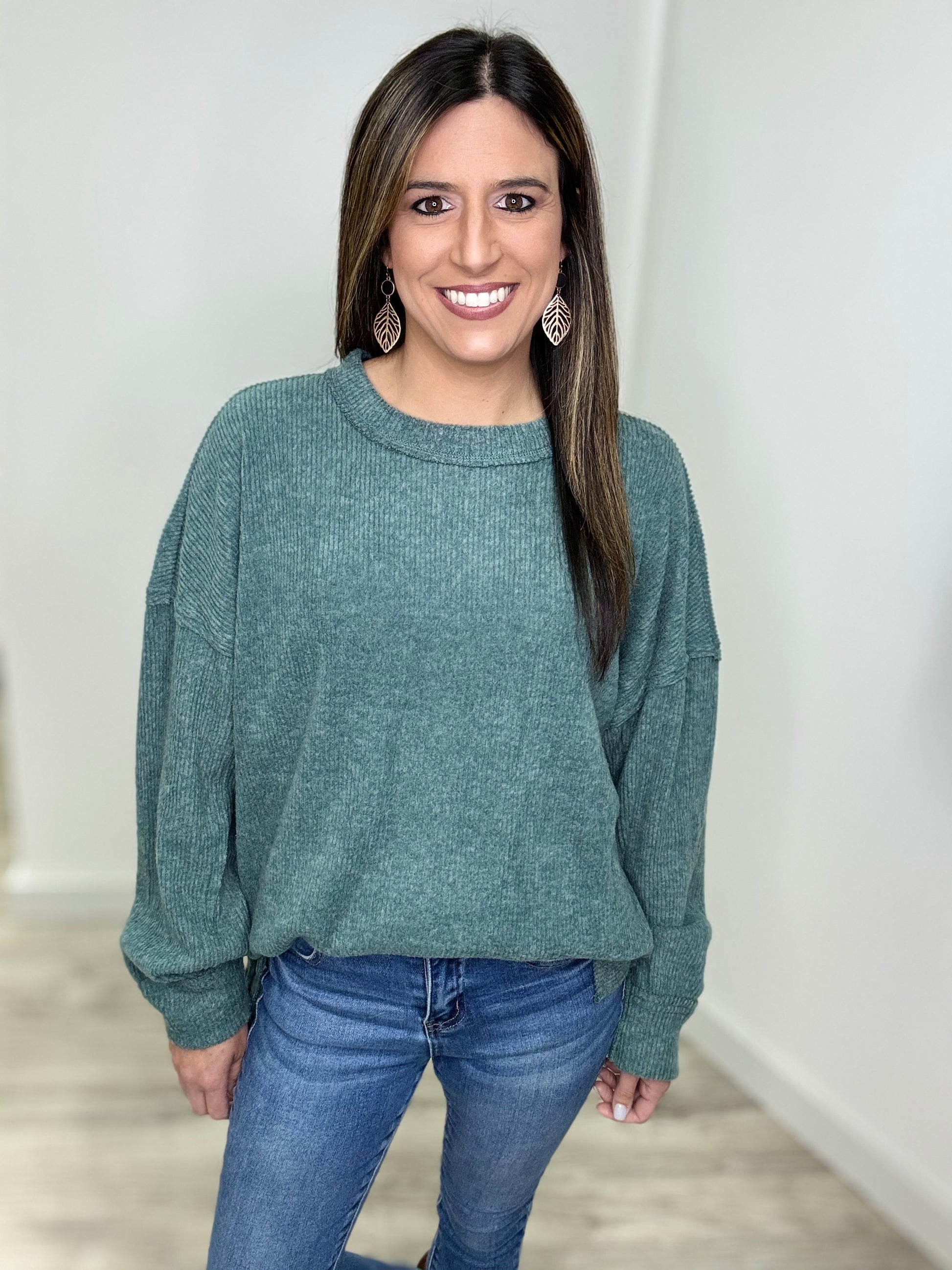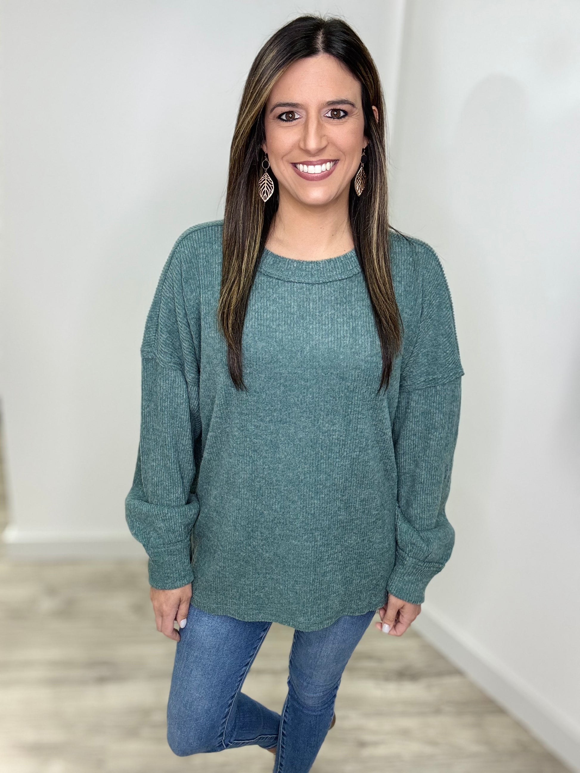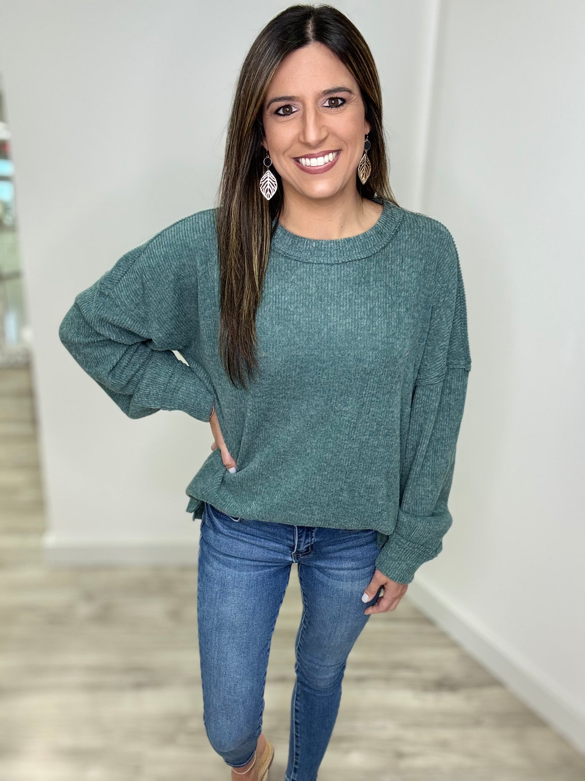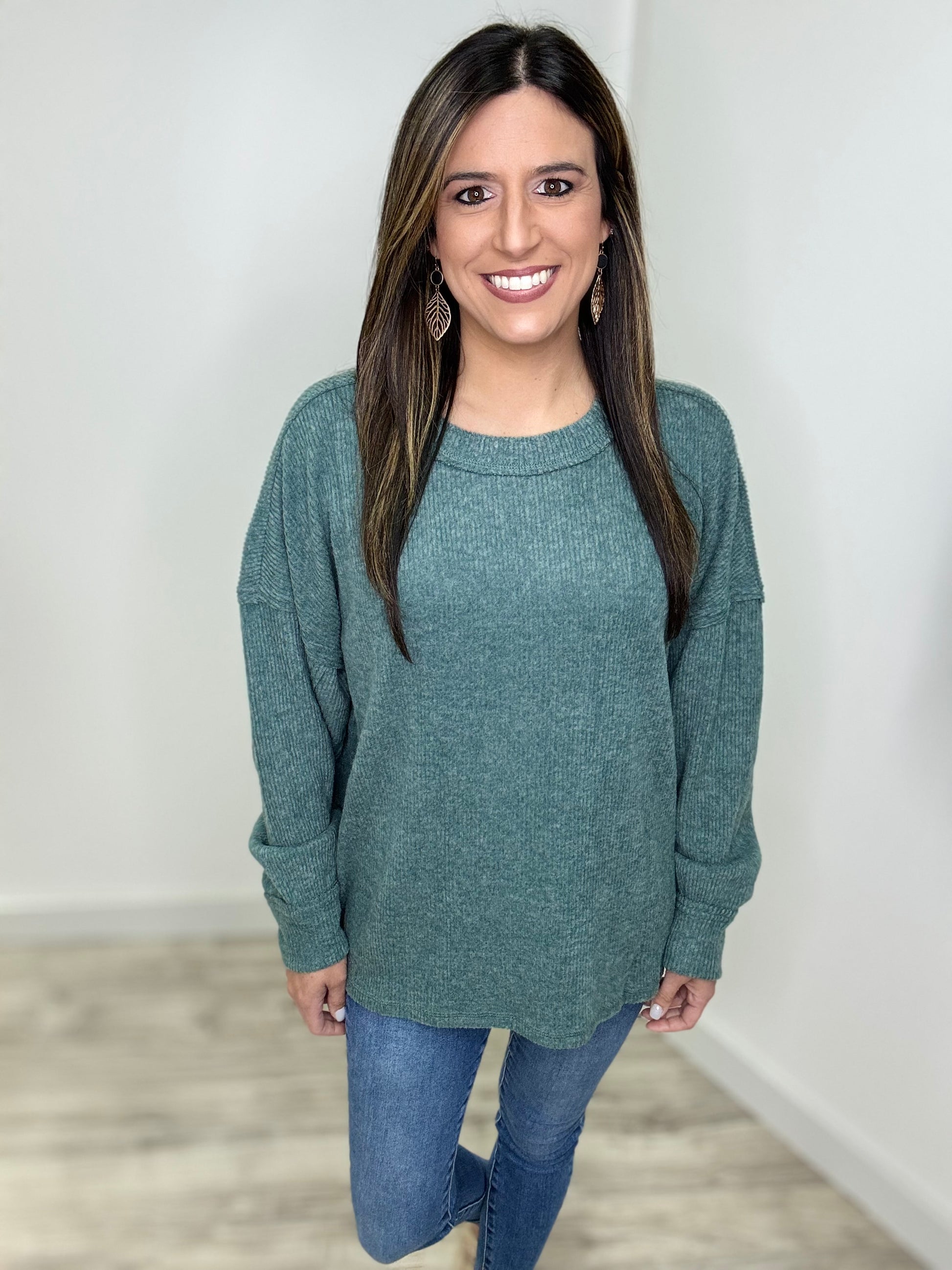 Get cozy as the weather cools with the Where To Top, available in playful blue and soothing ash jade. Crafted from the softest brushed ribbed fabric, this long-sleeve, round-neck favorite feels like a hug you’ll want to wear again and again. With a trendy drop shoulder and unique outside seams, it’s the perfect easygoing basic to freshen up your Fall wardrobe.